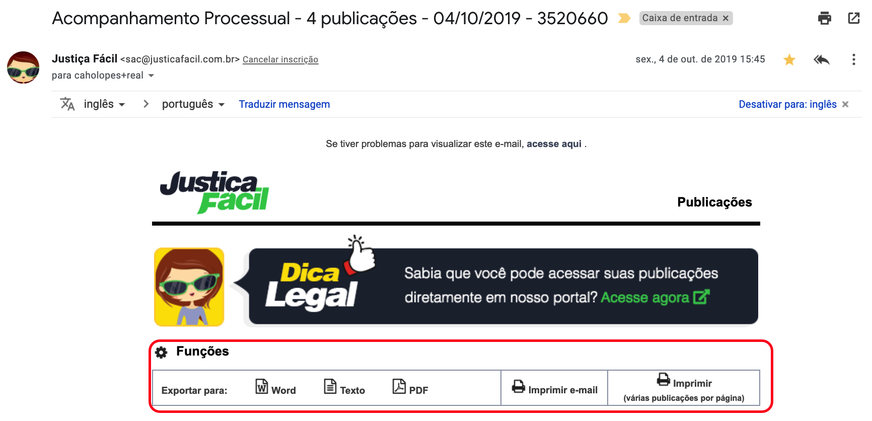 Na parte superior do e-mail onde você recebe suas publicações, você encontra as seguintes funções (no destaque em vermelho):