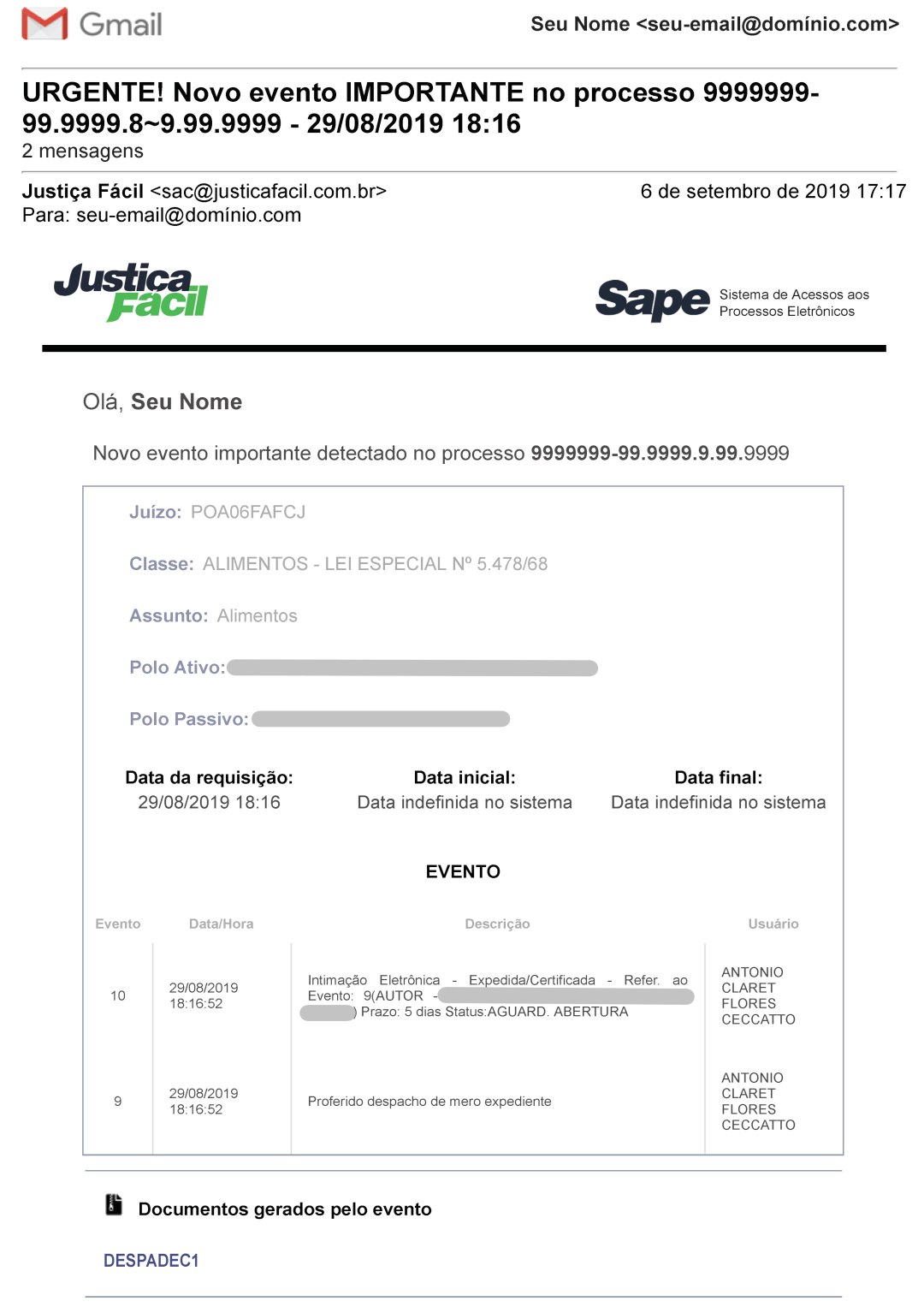 Nesta fase inicial, o sistema gera um alerta para cada evento importante que ocorrer nos seus processos eletrônicos, enviando um e-mail para você, contendo: