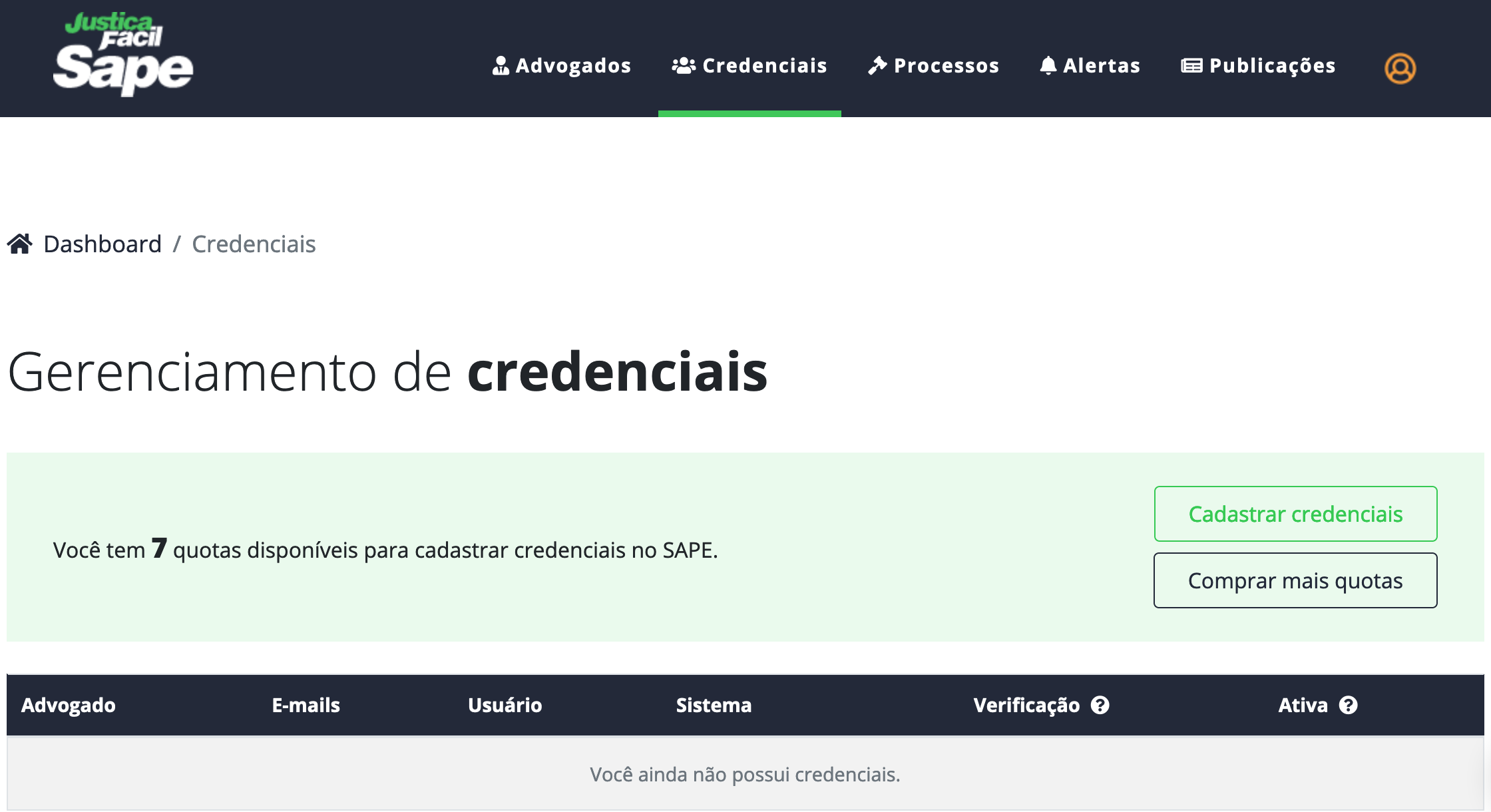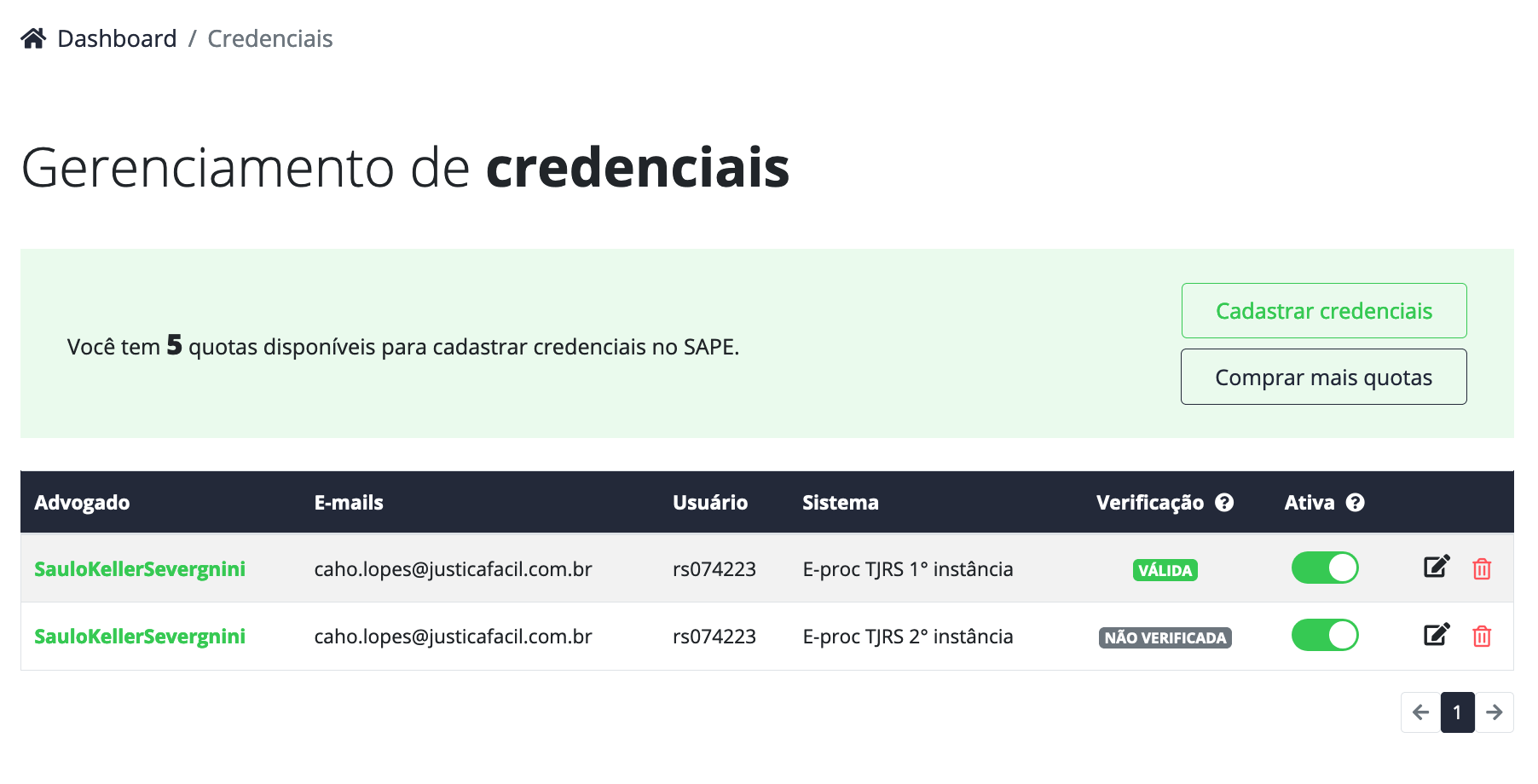 Pode ainda cadastrar quantas credenciais quiser, desde que tenha adquirido o número de quotas para tanto em nossa loja (o teste grátis dá direito a 7 quotas).