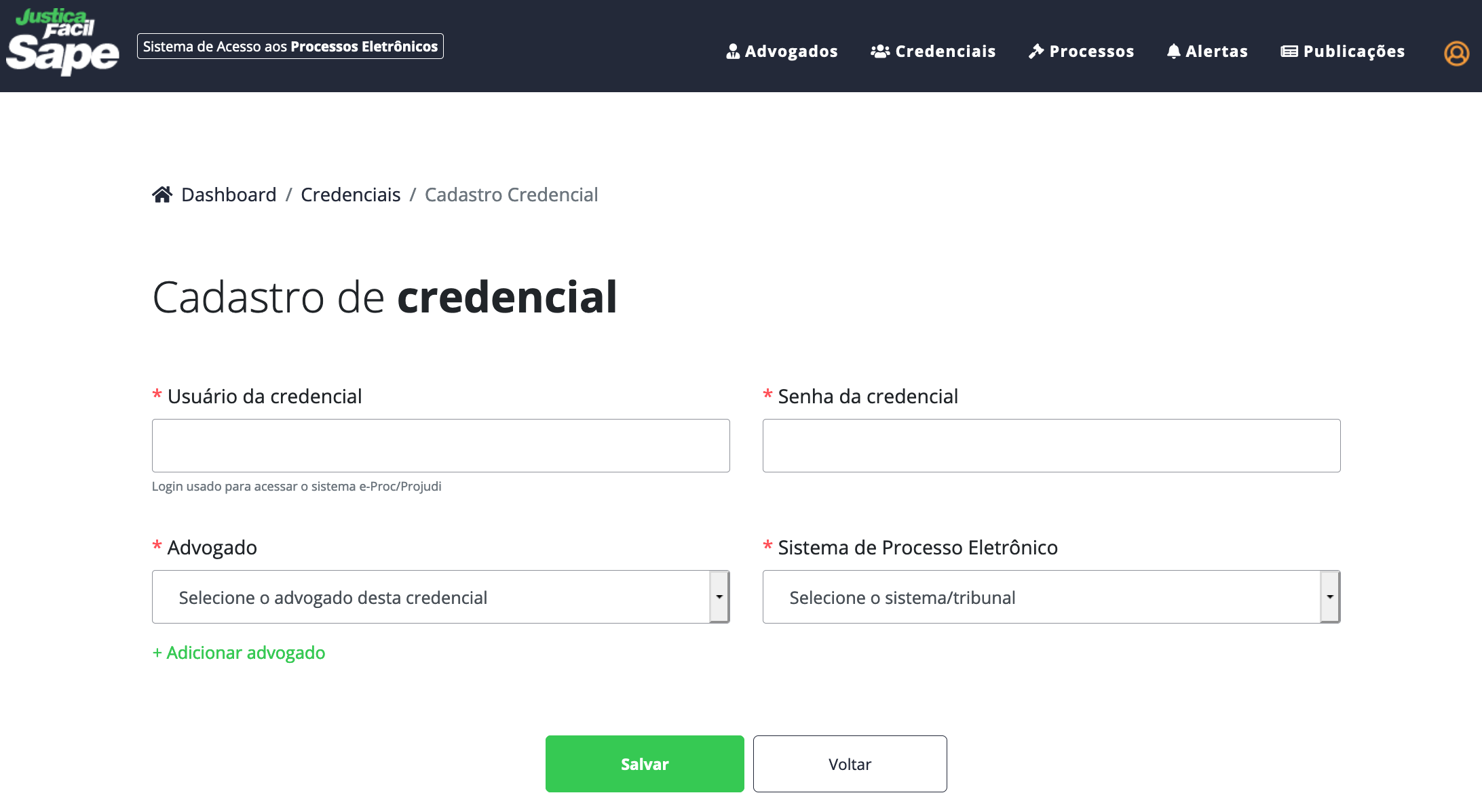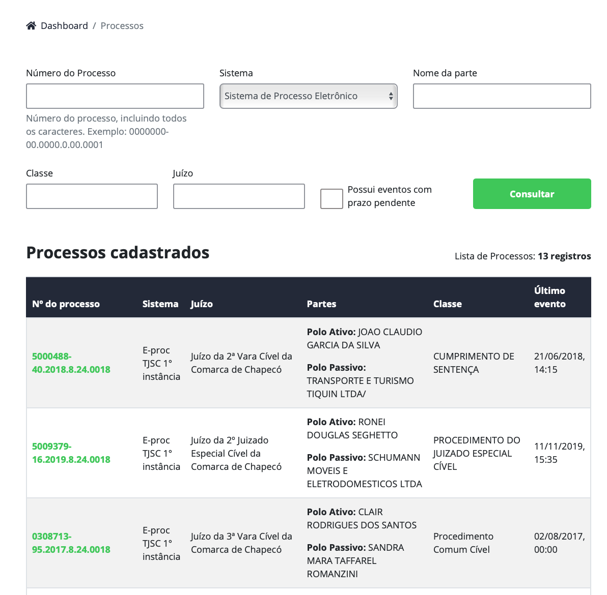 Você pode consultar os advogados cadastrados, além das credenciais. Basta clicar no menu superior. No menu Processos, você encontrará os seus processos organizados, com uma série de funcionalidades para que você possa acessá-los e dispor de suas informações.