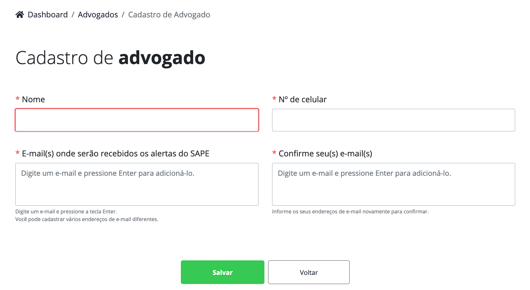 Você pode digitar quantos e-mails quiser para receber seus andamentos.