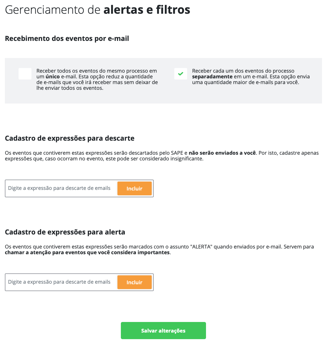 No menu “Alertas” você pode configurar suas preferências de recebimento de alertas e e-mails.